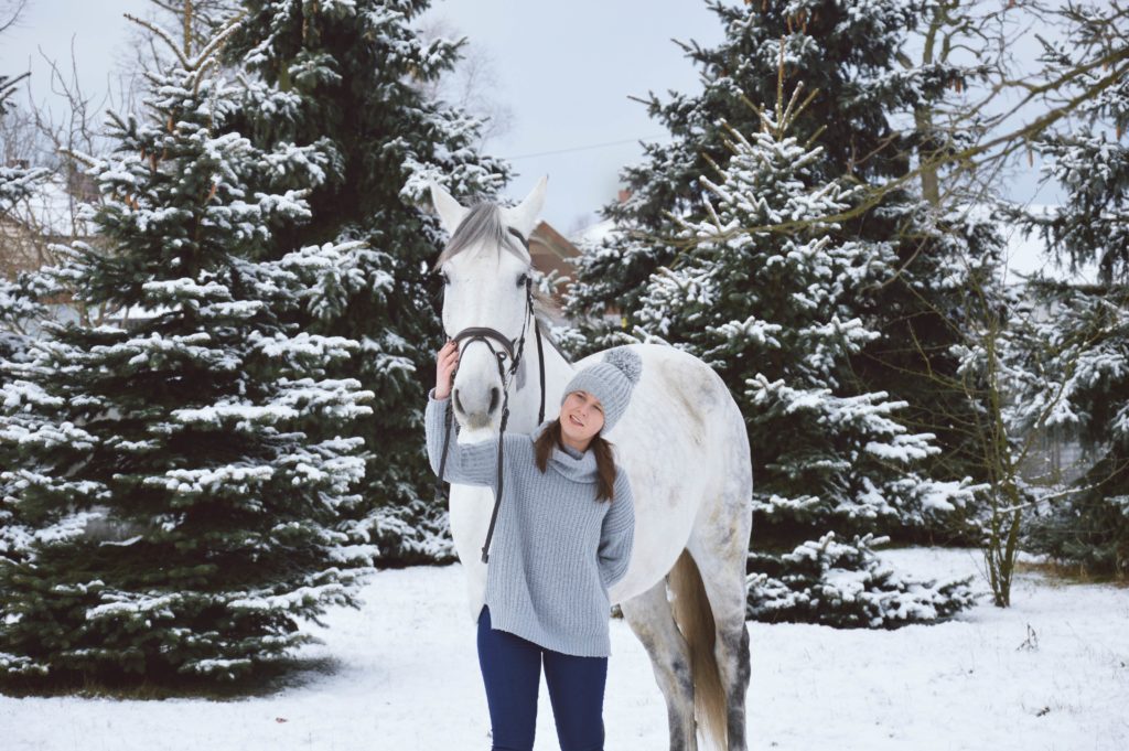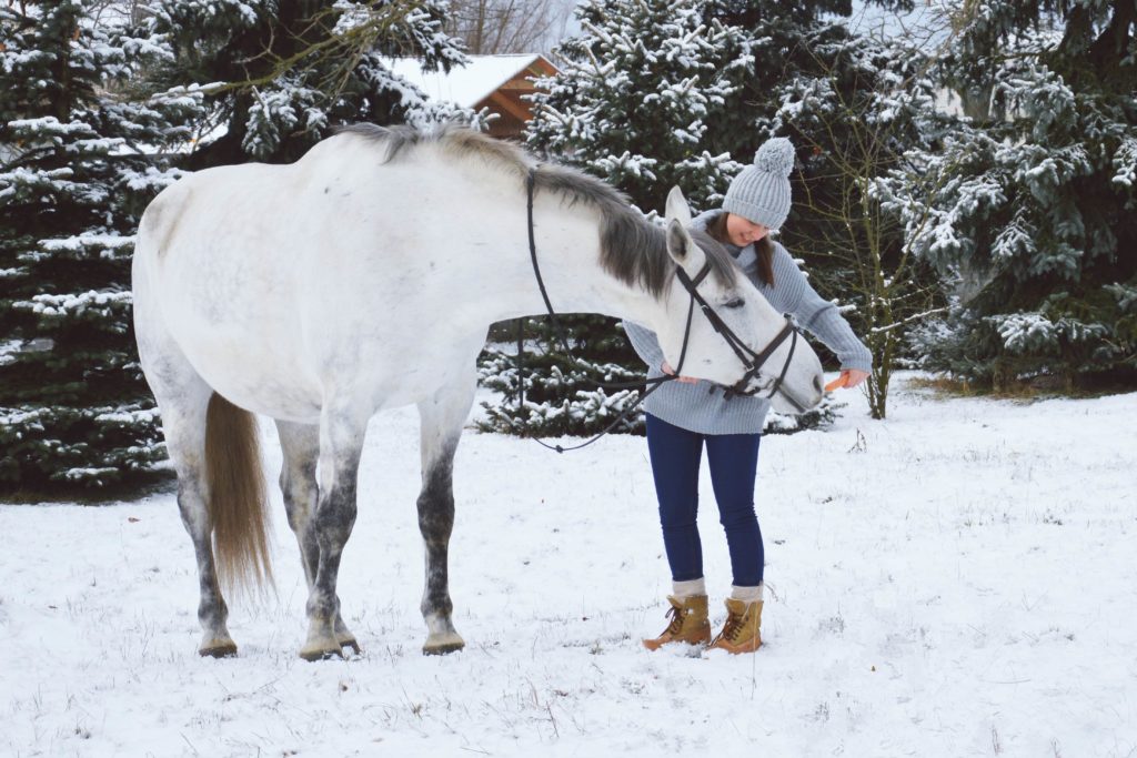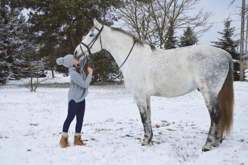 Korzystaliśmy też z terenów. Najpierw jeździliśmy na dwugodzinne wycieczki, a później, gdy podłoże już nie pozwalało, wróciliśmy do naszego lasku. Na szczęście w lesie niezależnie od pogody znalazło się miejsce do galopu, a niższe temperatury sprawiały, że Kaszmir mógł więcej bezkarnie pobiegać. Śnieg niestety zaszczycił nas swoją obecnością bardzo krótko, ale galopy po białym puchu dały dużą radochę. A do tego przepiękne widoki! Żałuję, że nie mieliśmy więcej śniegu tej zimy, ale teraz to już mu serdecznie dziękuję!