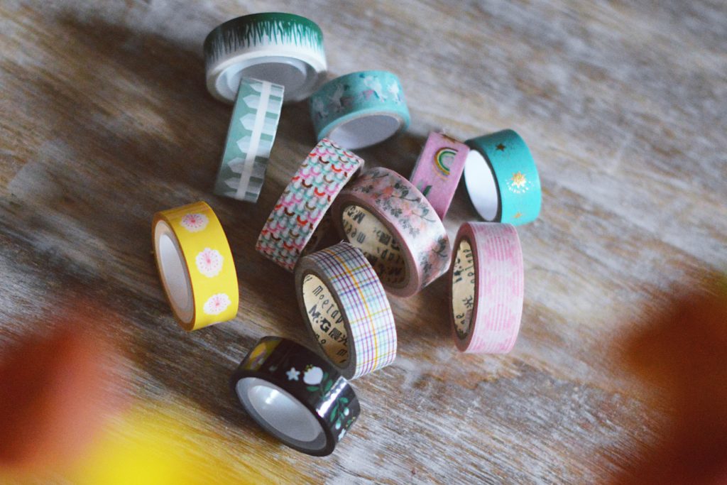 - taśmy dekoracyjne – w moim przypadku to papierowe taśmy washi i taśmy plastikowe. Większość z nich kupiłam we Flying Tiger, a pozostałe w małym papierniczym u mnie w mieście. Taśm plastikowych używam do dekoracji brzegów lub dołu strony w miejscach, gdzie wiem, że nie będę już nic pisać. Pisanie po tych taśmach jest bardzo trudne, bo wszystko się rozmazuje. Dlatego do miesięcznych rozkładówek używam washi. Bez większego problemu mogę na nich notować i zapisywać ważne wydarzenia.