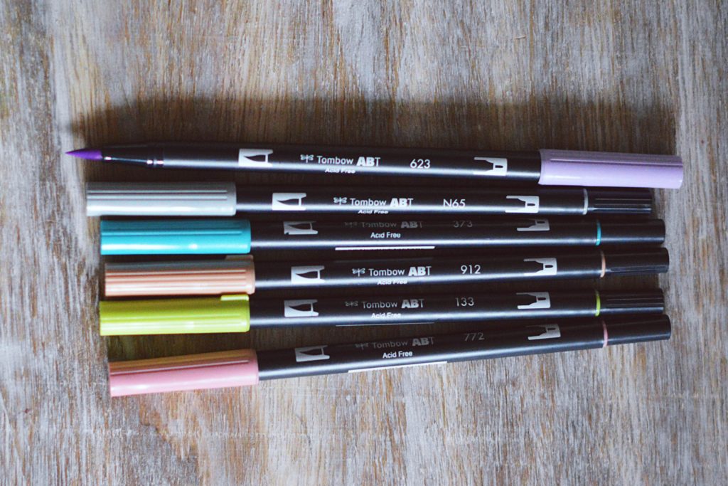 - tombow dual – posiadam go w 6 kolorach i wszystkie bardzo lubię. Używam ich do pisania tytułów, nazw miesięcy, numerów tygodni. Mają dosyć gruby pędzelek, więc efekt grubszej i cieńszej linii widać dopiero na większych literach. Podobnie, jak tombow fudenosake, jest bardzo przyjazny dla osób początkujących, choć nieco trudniejsze niż ich czarny koleżka.
