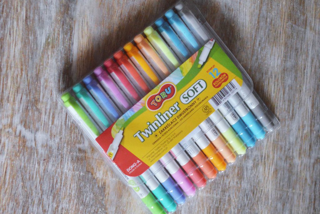 - zakreślacze pastelowe – uważam, że to jeden z lepszych wynalazków świata papierniczego. Koniec z neonem rażącym po oczach i przebijającym na drugą stronę kartki. Moje toru twinliner soft bardzo dobrze sprawdzają się do podkreślania oraz do skreślania wykonanych zajęć. Bardzo często używam ich też podczas robienia notatek na zajęcia. Z jednej strony mają końcówkę zakreślacza, a z drugiej normalny flamaster. No i są tańsze niż popularne stabilo.