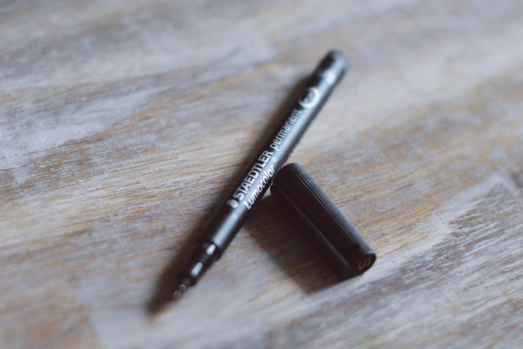 - permanentny cienkopis – również czarny. Obecnie używam steadtlera lumocolor s i służy mi do pisania po taśmy ozdobny. Jest szybko schnący, więc się nie rozmazuje. Jednak nie polecam go do pisania po zwykły kartkach. Jak każdy pisak permanentny przebija wszystko!