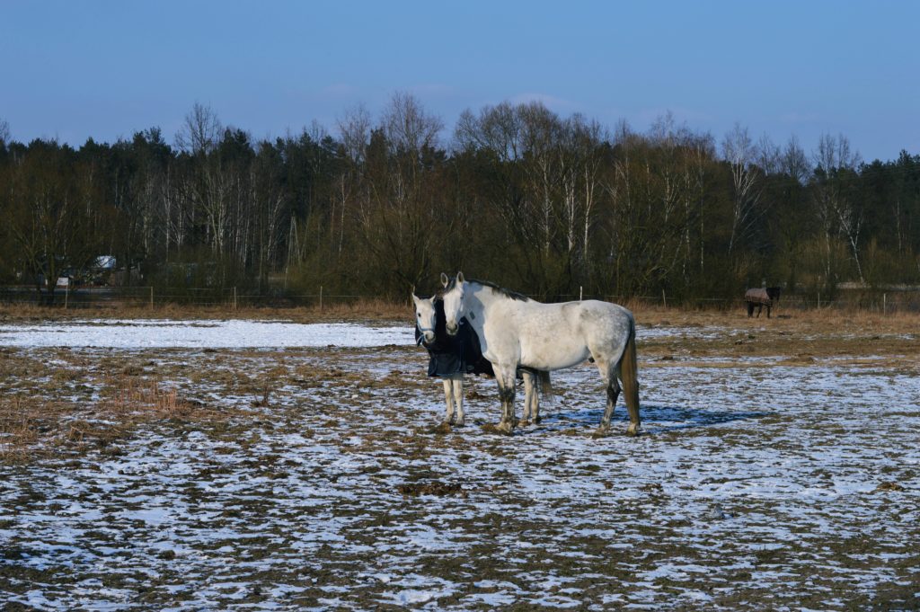 Było to dwa dni przed moim planem wypuszczenia go na padok, ale postanowiłam, że godzina na dworze dobrze mu zrobi. Mrozy jeszcze trochę trzymały, więc nie chciałam, żeby Kaszmirowy się przeziębił – w końcu cały miesiąc stał w ciepłej stajni. Jeśli spodziewaliście się szalonych wariactw i dzikich galopów po padoku po wyprowadzeniu Siwego na padok, muszę Was rozczarować. Wraz z wejściem na padok, Kaszmir zamienił się w aniołka, przywitał się z kolegami i tyle. Następne dwa dni podobnie, a później już zaczął wietrzyć się całe dnie.