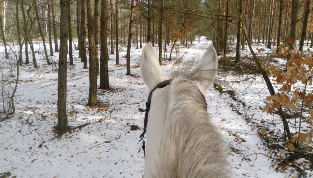 Jazdy zaczęliśmy od niedzielnego stępo-spacerku do lasu. Byliśmy w nim ok. 30 minut, ale wreszcie zobaczyliśmy świat z trochę innej perspektywy i przede wszystkim wreszcie coś innego niż plac. Kilka rzeczy Kaszmira zdziwiło, ale żadnych ucieczek i wariactw nie było.