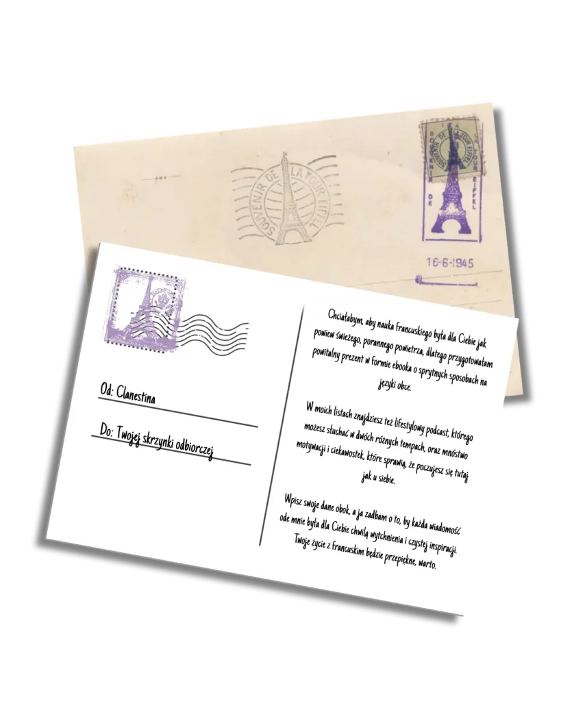 Zaraz po tym, jak dołączysz do mojej społeczności, zaczniesz otrzymywać ode mnie darmowe materiały, które pomogą Ci oswoić ten piękny język i sprawią, że poczujesz się w nim pewniej każdego dnia. W moich wiadomościach czekać będą na Ciebie lifestylowe podcasty nagrane w dwóch różnych tempach, abyś mogła oswajać się z brzmieniem francuskiego dokładnie w swoim rytmie, bez pośpiechu i zbędnej presji.