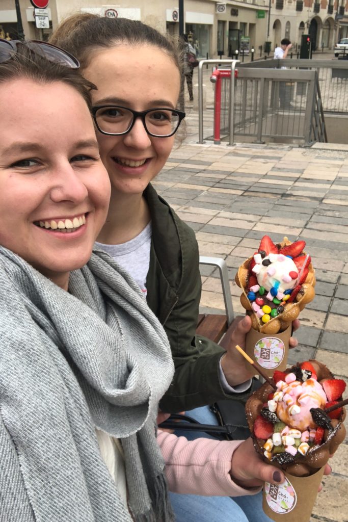 Kolejnym punktem na mojej przedwyjazdowej liście były gofry bąbelkowe. Zdecydowania przerosły moje oczekiwania, jeśli chodzi o wielkość i smak. Jeśli miałabym się do czegoś przyczepić, to byłyby to lody o smaku matcha. 7 Zielona herbata, jako lód to zdecydowanie nie moje połączenie smaków – ani gorzkie, ani słodkie. Za to cała reszta była przepyszna i mogłabym częściej jadać takie lunche 😉